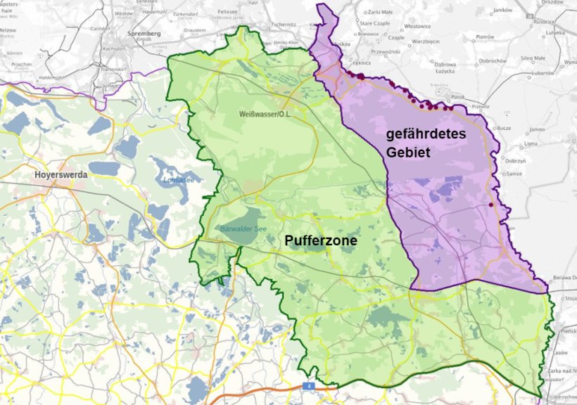 Das gefährdete Gebiet wird nach Süden bis zur Höhe der Gemeinde Horka ausgeweitet. Seine Fläche vergrößert sich von bisher 157 auf nun 322 Quadratkilometer. Im Osten wird es vom bereits bestehenden festen Wildschweinabwehrzaun an der Neiße begrenzt. Die Pufferzone dehnt sich nunmehr auf den gesamten Landkreis Görlitz nördlich der A 4 aus. Das Gebiet der Pufferzone erweitert sich von 605 auf 826 Quadratkilometer.