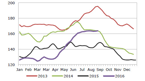 Nach einer flachen Preiskurve Anfang 2016 sind die Preise seit Ende April dieses Jahres konstant angestiegen. Seit Anfang Juli bewegen sie sich oberhalb von 160 Euro/100 kg und haben sich inzwischen auf ca. 165 Euro/100 kg eingependelt. Dieser Preisanstieg ist vor allem den vermehrten Exporten nach China und einem ausgeglicheneren Verhältnis zwischen Angebot und Nachfrage in der EU zu verdanken. Der Ferkelpreis stabilisierte sich – nach einer leichten Erholung der Wochennotierung Anfang Januar 2016 – zwischen Februar und Ende Mai auf einem Niveau von rund 40 Euro, gefolgt von einem leichten Anstieg Anfang Juni und einer erneuten Stabilisierung im Verlauf des Sommers. Der EU-Durchschnittspreis lag im August bei etwa 43 Euro/Tier und damit um 30 % über dem der Vorjahresperiode. In Spanien ist allerdings bereits seit Mitte Juli, d. h. früher als saisonal üblich, ein Rückgang der Ferkelpreise zu beobachten, obwohl diese immer noch weit über dem Vorjahresniveau liegen.