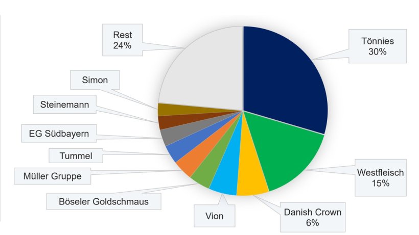 Mit deutlichem Abstand an der Spitze des Rankings der größten deutschen Schweineschlachtunternehmen blieb Tönnies. Das Minus von 5,6 % bei den Schweineschlachtungen im Jahr 2024 darf nicht über den weiteren Wachstumskurs des Unternehmens hinwegtäuschen. Das zweiplatzierte Unternehmen Westfleisch konnte seine Schlachtungen um 6,2 % auf 6,9 Mio. Schweine erhöhen. Das bedeutet, dass sich der Marktanteil Westfleischs um 0,7 Prozentpunkte auf 15,5 % gesteigert hat. Durch den Vion-Rückzug aus dem deutschen Markt wird der Abstand der beiden führenden Unternehmen Tönnies und Westfleisch zum dritten Platz nun deutlich größer. Platz 3 nimmt nun Danish Crown ein. Im aktuellen Ranking 2024 taucht Vion noch einmal auf Platz 4 mit 2,4 Mio. Schlachtungen auf, bevor es im kommenden Jahr aus der Liste verschwinden wird.