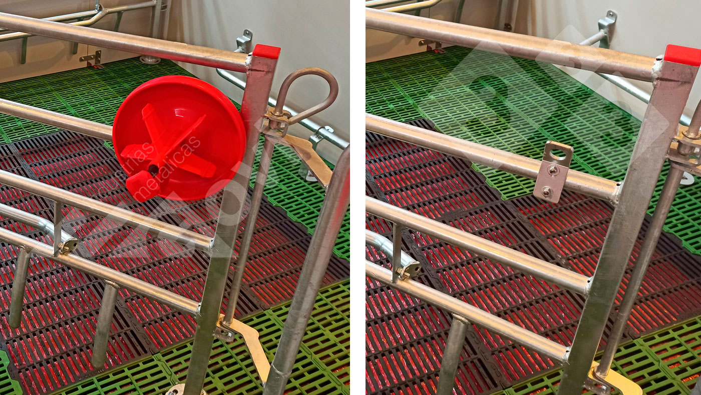Bei diesem System wird jeder Futtertrog für die Ferkel an der Halterung angebracht, die in jeder Abferkelbucht installiert wurde. Die vertikale Aufhängung hat den Vorteil, dass der Futtertrog viel einfacher zu reinigen und zu trocknen ist.