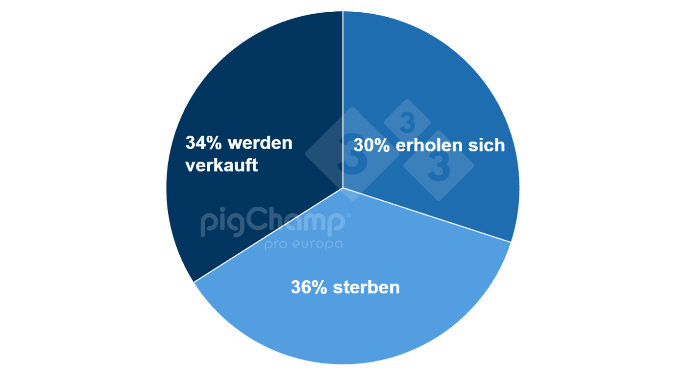 Die folgende Grafik zeigt die Verteilung dieser Sauen nach ihrem endgültigen Schicksal. Auf jede Kategorie entfällt etwa ein Drittel, d. h. nur 30 % der Sauen, die keine Ferkel abgesetzt haben, erholen sich. Was das Durchschnittsalter dieser Sauen betrifft, so sind die Sauen, die zur Schlachtung gebracht werden, älter (Parität 4,9), während die Sauen, die sich erholen, jünger sind (Parität 3,0). Diejenigen, die sterben, haben ein mittleres Alter (Parität 3,7).