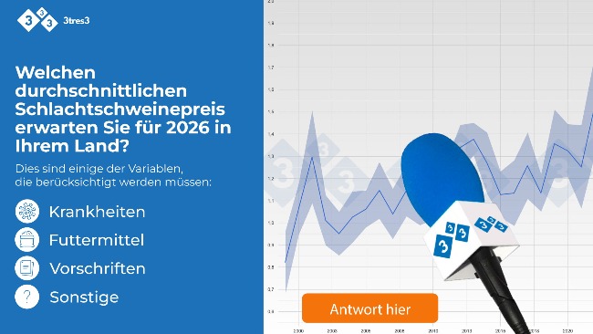 Wie zu Beginn eines jeden Jahres fragen wir Sie wieder nach dem durchschnittlichen Marktpreis für Schweine in Ihrem Land. In Kürze werden wir die Ergebnisse Ihrer Prognosen für 2025 veröffentlichen, aber jetzt sind wir daran interessiert, zu erfahren, wie Sie das Jahr 2026 einschätzen.