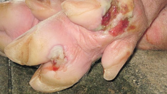 On the finisher sites, the farmer noticed that the growing pigs in all the farm sheds had become dull and lame.