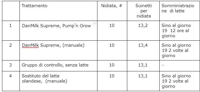 L'obiettivo dello studio era valutare l'effetto di due diversi tipi di latte sull’indice di  sopravvivenza dei suinetti. Sono stati confrontati DanMilk Supreme e un sostituto del latte di  produzione olandese contenente plasma. Inoltre, come obiettivo secondario, per DanMilk  Supreme sono state confrontate due modalità di somministrazione (somministrazione manuale vs Pump’n Grow).