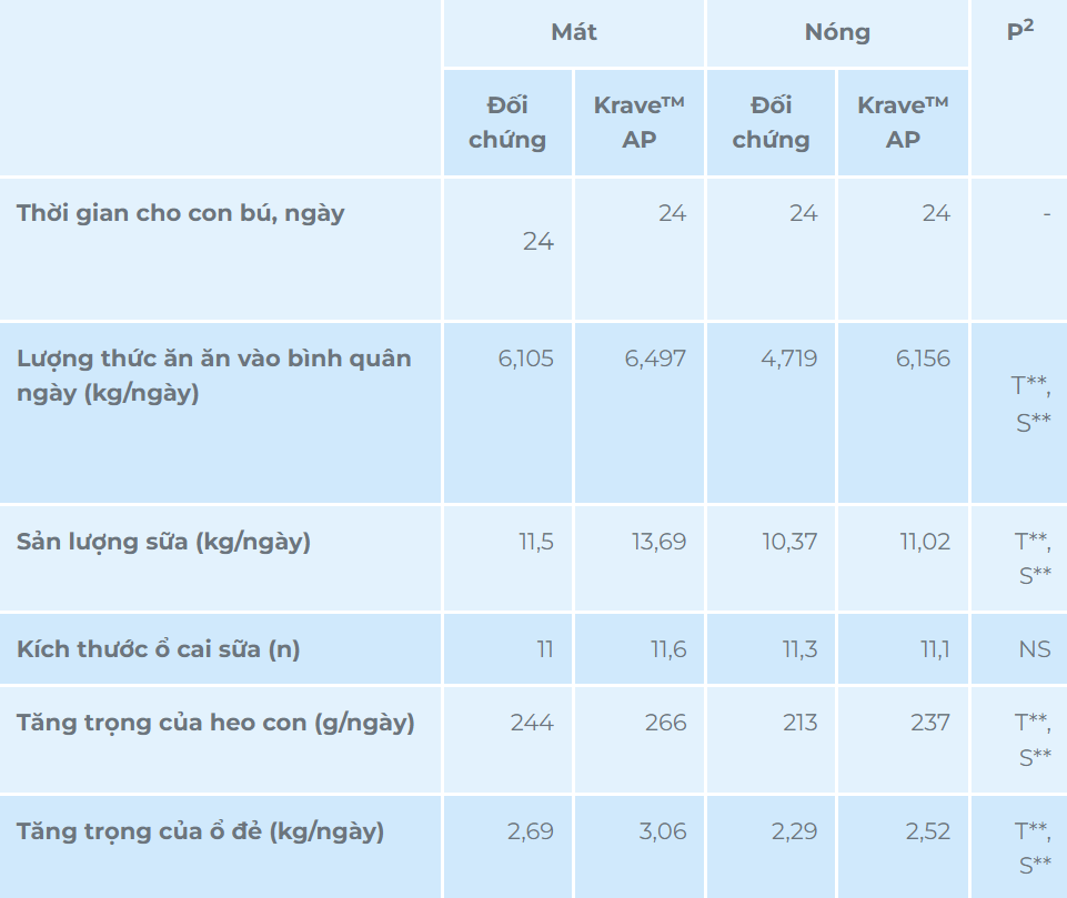 Một thử nghiệm được thực hiện tại Brazil (Silva và cs, 2021) đã nghiên cứu tác động của KRAVE™AP đối với heo nái nuôi con trong điều kiện nóng và mát. Sáu mươi con heo nái được chia thành hai nhóm, một nhóm ăn khẩu phần đối chứng và nhóm còn lại ăn khẩu phần có bổ sung KRAVE™AP (500g/tấn) trong thời gian cho con bú kéo dài 24 ngày. Thử nghiệm theo dõi lượng thức ăn ăn vào, sản lượng sữa và sự tăng trưởng của heo con. Kết quả cung cấp những hiểu biết có giá trị cho các khu vực như miền Bắc Việt Nam, nơi có nhiệt độ và độ ẩm cao tương tự.