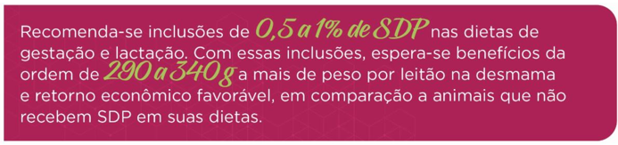 Vitagliano at al. (2009) avaliaram a adição de 1% de SDP na dieta, por meio de um suplemento, para matrizes da cobertura a 35 dias de gestação durante os meses de verão, em Santa Catarina, Brasil, e verificaram: