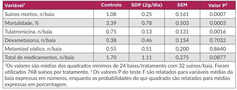 Um total de 1.536 suínos em crescimento (65 dias de idade) foram distribuídos em 24 baias de machos castrados e 24 baias de fêmeas (32 suínos/baia). Os suínos foram distribuídos aleatoriamente em um grupo controle ou em um grupo com SDP (24 repetições/tratamento). Ambos os grupos apresentaram o mesmo status sanitário, ração e programa vacinal. O grupo SDPrecebeu 2 g de SDP aplicados sobre a ração diariamente durante a fase de crescimento e terminação, de 98 dias. A cada dia, 64 gde SDP foram adicionados ao cocho e misturados manualmente à ração de cada baia com 32 animais, fornecendo assim 2 gde SDP por suíno. Mortalidade e uso de medicamentos foram registrados por baia ao longo do estudo. A baia foi considerada unidade experimental, e os dados foram analisados usando um modelo misto para os efeitos principais de tratamento esexo, com a repetição como efeito aleatório. Probabilidadesde qui-quadrado foram relatadas para os resultados expressos em porcentagem.