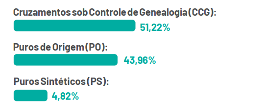 Em 2024, a maior parte dos registros foi composta por fêmeas, que representaram 94,90% do total, enquanto os machos corresponderam a 5,10%. A distribuição por categoria genética foi a seguinte: