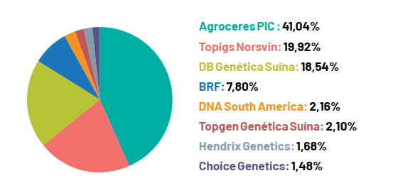 Outros estados, como São Paulo, Distrito Federal e Rio Grande do Sul, responderam por 5,37% do total.EMPRESAS DE GENÉTICA IMPULSIONAM O SETORO relatório também destaca o papel estratégico das empresas de genética na disseminação de material genético qualificado. No ranking nacional quanto às emissões de registros a Agroceres PIC responsável por 41,04% dos registros, seguida pela Topigs Norsvin (19,92%), DB Genética Suína (18,54%), BRF (7,80%), DNA South America (2,16%), Topgen Genética Suína (2,10%), Hendrix Genetics (1,68%) e Choice Genetics (1,48%).