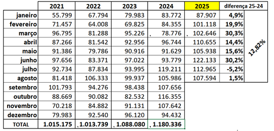 Tabela 1. Volumes exportados de carne suína brasileira in natura (em toneladas), mês a mês, em 2021, 2022, 2023, 2024 e de janeiro a agosto de 2025.