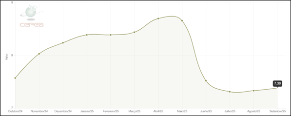 Analisando estes dados de exportação das três proteínas e ponderando a disponibilidade interna, a redução dos embarques de frango foi mais que compensada pelo incremento das exportações de carne bovina e suína. Neste contexto, com a recuperação gradativa dos volumes normais de embarque de carne de aves em agosto e que, na parcial de setembro (até dia 12) se mantém, as cotações das carcaças de frango resfriado que despencaram em junho/25 no atacado de São Paulo (gráfico 1), apresentam significativa recuperação em setembro, com destaque para os últimos dias (gráfico 2), após a reabertura da União Europeia.