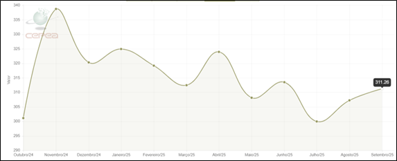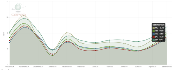 Gráfico 5. Indicador SUÍNO VIVO – CEPEA/ESALQ (R$/kg) em MG, PR, RS, SC e SP, diário, nos últimos 12 meses. Preços indicados no gráfico referentes ao mês de setembro/25, até dia 16/09.