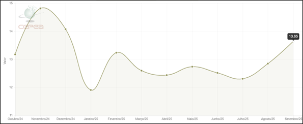 Gráfico 4. Indicador CARCAÇA SUÍNA ESPECIAL – CEPEA/ESALQ (R$/kg) em São Paulo/SP, mensal, nos últimos 12 meses. Média de setembro/25 até dia 16/09/2025.