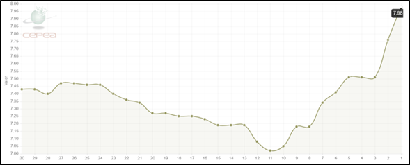 O farelo de soja também experimentou pequena alta na maioria das praças brasileiras. Como as cotações do suíno tiveram ganho consistente, mesmo com a alta dos principais insumos, a relação de troca permanece bastante favorável (gráfico 7).