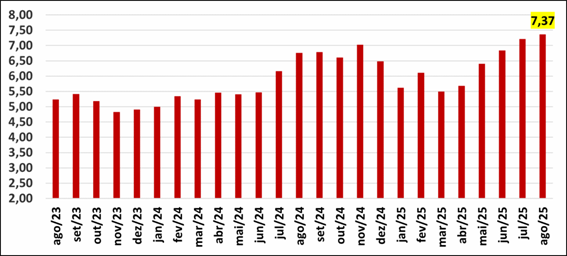 Conforme demonstra a tabela 4, a seguir, o crescimento das exportações de carne brasileira em 2025 não se restringe à proteína suína. A carne bovina vem superando com sobras os volumes do ano passado, sendo que agosto/25, apesar do “tarifaço” dos Estado Unidos, foi o segundo melhor mês em volume exportado da história, com mais de 268 mil toneladas in natura embarcadas, mesmo com o baixo volume importado pelos EUA (pouco mais de 6 mil toneladas), um recuo de mais de 50% em relação ao mês anterior.