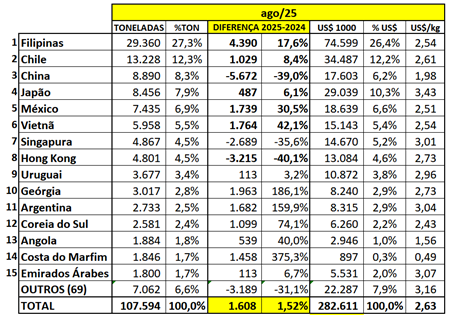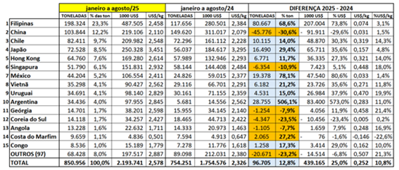 Filipinas continuam liderando as nossas exportações e a China, embora no acumulado do ano ainda ocupe a segunda posição (tabela 2), vem diminuindo suas compras significativamente, sendo que, no mês de agosto/25 (tabela 3), China e Hong Kong, somados, não chegam a metade do volume embarcado para as Filipinas.