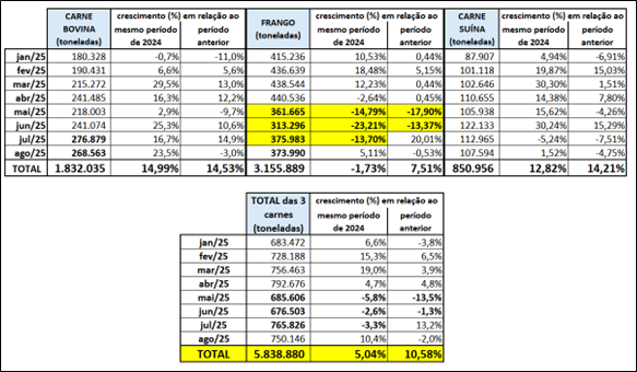 Tabela 4. Exportações brasileiras de carnes bovina, de frango, suína e somatório das três, in natura, em toneladas, de janeiro a agosto de 2025, comparado com o mesmo período de 2024 e com o período anterior. Destaque (em amarelo) para as quedas nos volumes de frango de maio a julho/25, devido ao foco de Influenza aviária no RS e para o incremento do total somado das três carnes, com crescimento de 5,04% em relação ao mesmo período do ano passado e de 10,58% em relação aos sete meses anteriores.