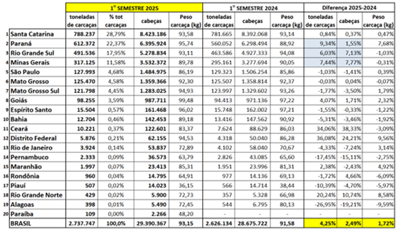 Tabela 5. Abate de suínos do primeiro SEMESTRE de 2025 por unidade federativa, comparado com o mesmo período do ano passado. Destaque para alta do Paraná, Rio Grande do Sul e Minas Gerais (azul).