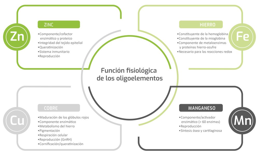 Aunque sólo representan una pequeña parte de la dieta general, los microminerales - como el zinc, el hierro, el manganeso y el cobre- son esenciales para la salud. Por ejemplo, el zinc es necesario para mantener una inmunidad fuerte, los ciclos de reproducción, la salud de la piel y las pezuñas, el desarrollo muscular y la producción de leche. La necesidad de zinc aumenta durante la gestación y la lactancia y durante situaciones de estrés como el calor extremo, los cambios de alimentación y los traslados.