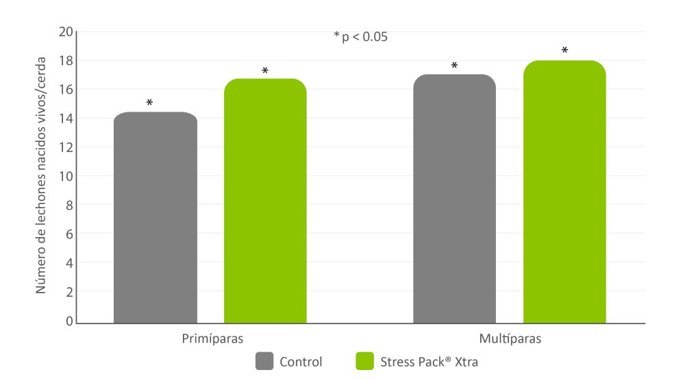 Figura 3: Las cerdas primíparas y multíparas suplementadas con Stress Pack® Xtra tuvieron significativamente más lechones nacidos vivos mientras estuvieron expuestas a condiciones de estrés térmico. Las cerdas primíparas suplementadas con Stress Pack® Xtra tuvieron un aumento del 16 % de lechones nacidos vivos y las cerdas multíparas tuvieron un aumento del 5 % de lechones nacidos vivos (p < 0,05).