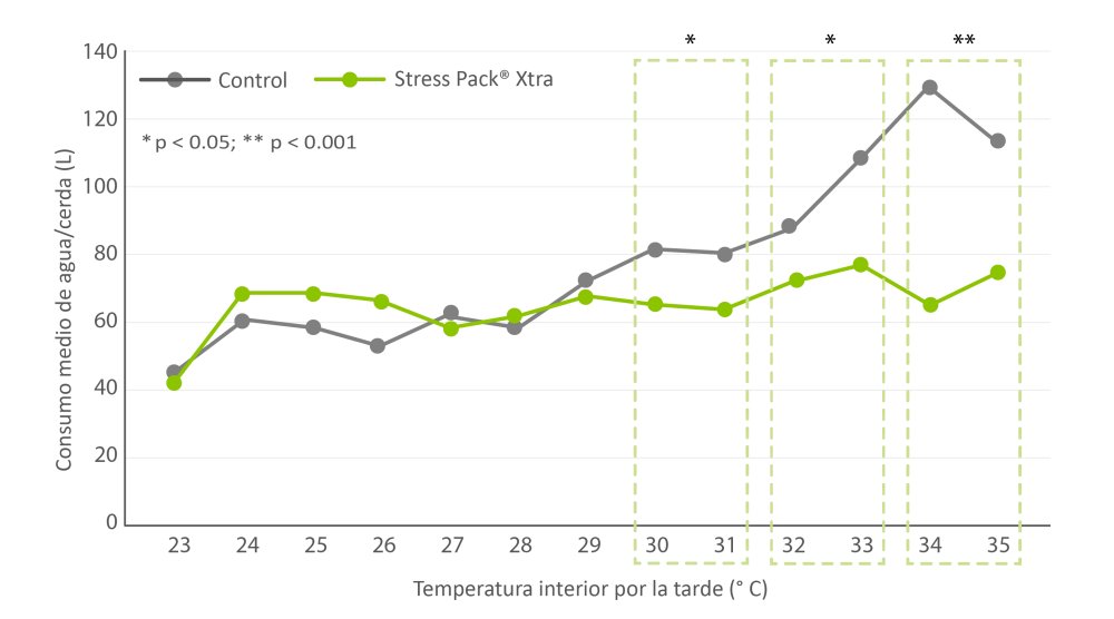 Además del tejido corporal y las funciones metabólicas, el agua se utiliza para la termorregulación. Por lo tanto, el aumento del consumo de agua puede ser una respuesta al estrés térmico. De media, las cerdas suplementadas con Stress Pack® Xtra consumieron aproximadamente un 17 % menos de agua que las cerdas del grupo control. Además, las cerdas suplementadas consumieron menos agua a temperaturas ≥ 29 ° C (p < 0,05) y significativamente menos agua a temperaturas internas ≥ 30 ° C (p < 0,001, Figura 4).