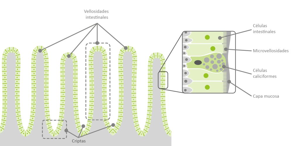 El interior del intestino delgado presenta proyecciones en forma de dedos llamadas vellosidades, formadas por células intestinales con proyecciones más pequeñas llamadas microvellosidades. Las células intestinales se reemplazan en «criptas», donde las células madre se dividen y diferencian en células intestinales maduras y células caliciformes productoras de mucus. Estas células migran a la punta de las vellosidades y finalmente se desprenden hacia la luz intestinal (Figura 1).
