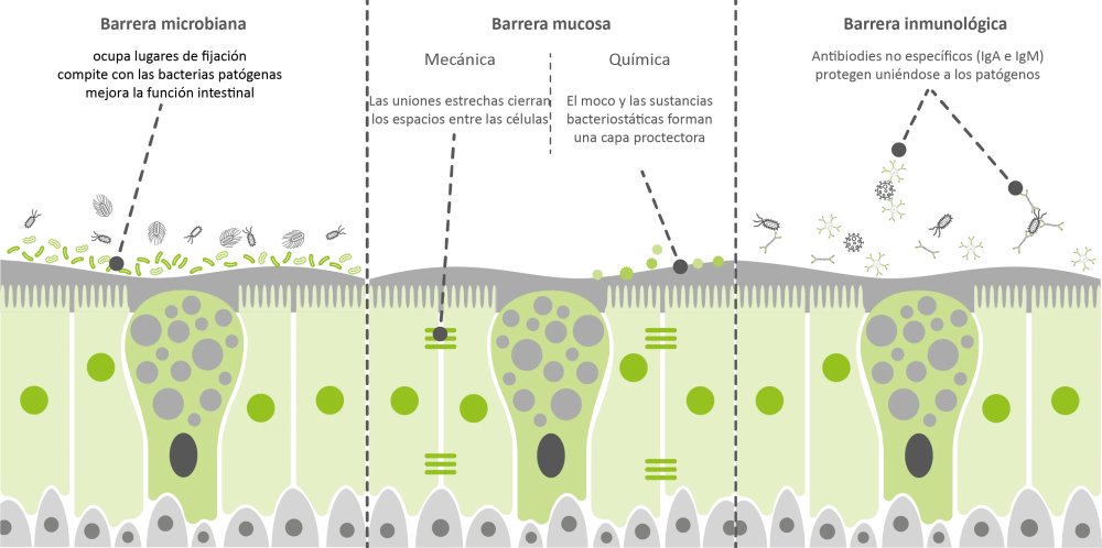 Los lechones desarrollan una comunidad microbiana diversa y compleja en el tracto gastrointestinal a través del consumo de leche y la exposición al ambiente externo. Este equilibrio dinámico entre las diferentes bacterias intestinales beneficiosas constituye la barrera microbiana. La barrera microbiana tiene tres funciones básicas que proporcionan una primera línea de defensa contra los patógenos: 1) ocupar los sitios de unión y adhesión; 2) competir con las bacterias patógenas por los nutrientes; y 3) mejorar la función intestinal. La microbiota está frecuentemente expuesta a diversos antígenos y los componentes microbianos de los alimentos están particularmente influenciados por la dieta. Además, los cambios microbianos pueden afectar significativamente el crecimiento y desarrollo de los animales.