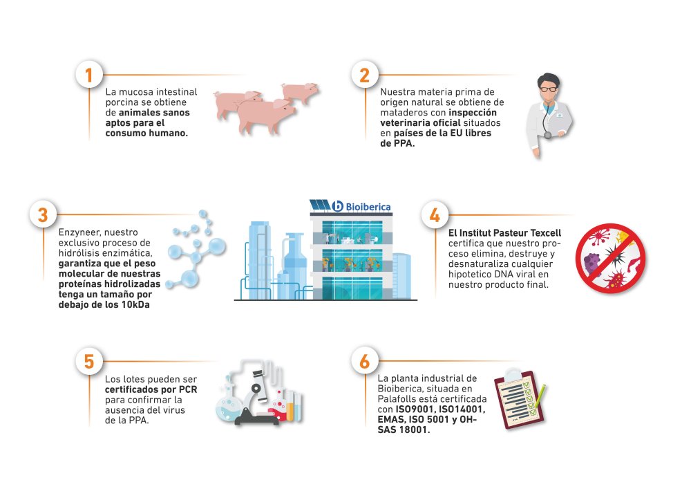La investigación de Institut Pasteur Texcell no deja dudas sobre la inactivación total de la potencial infectividad del virus en la mucosa intestinal porcina en caso de posible ruptura de la bioseguridad en las medidas tomadas para prevenir la propagación de la PPA en Europa. Por esta razón, Bioibérica garantiza que su materia prima no contiene ningún virus.