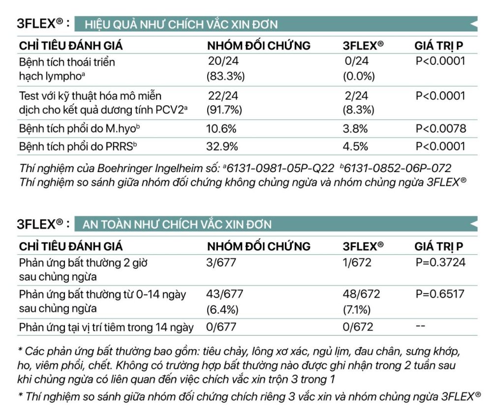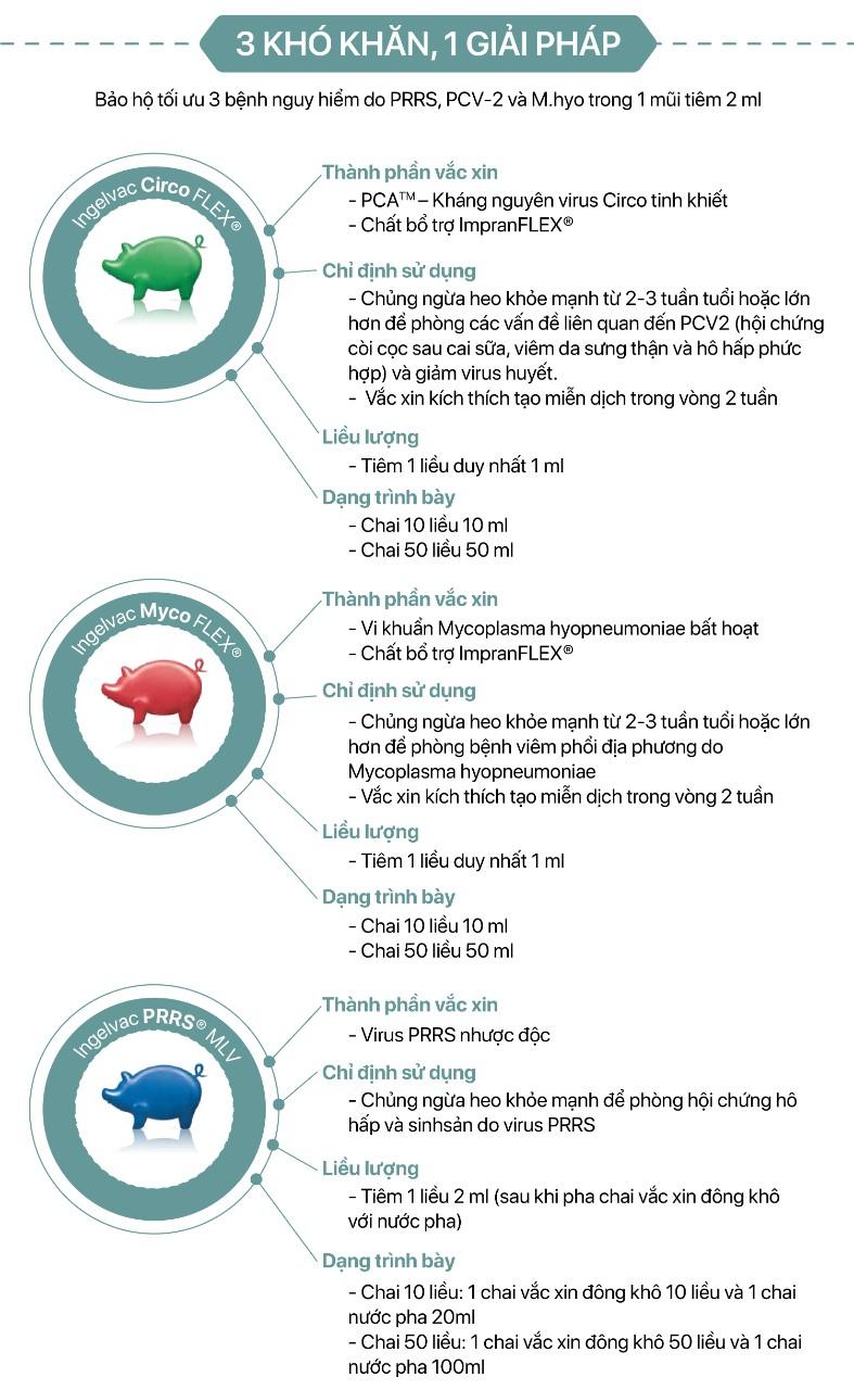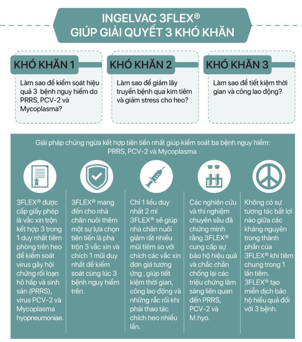 Điều tạo nên sự độc đáo của combo phối trộn 3FLEX (trộn 3 sản phẩm Ingelvac CircoFlex + Ingelvac MycoFlex + Ingelvac PRRS MLV) đến từ thương hiệu FLEX VACCINE chính là: