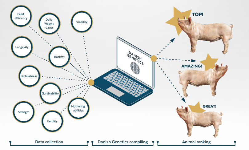 The animals’ characteristics are measured in different types of units. For example, the animals’ growth is measured in g/day, while their fertility is based on a precise number of piglets. We need to combine all the characteristics to gather them in a same equation by defining a common denominator. Each characteristic is multiplied by its’ importance, as Danish Genetics assigns – and reevaluates – a unique weight, or „coefficient“, to each characteristic, based on our bio-economical model, developed together with Abacus bio.