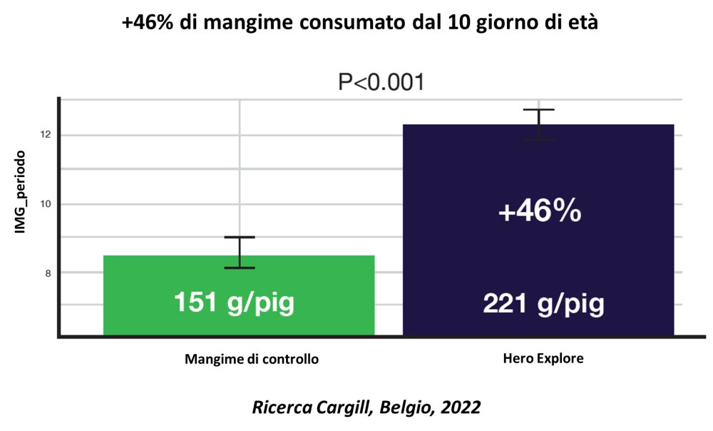 Hero Explore rappresenta una vera innovazione nell’alimentazione dei suinetti: la sua forma fisica diversificata che unisce pellet, fiocchi ed estrusi e il profumo dato dall’utilizzo di aromi, stimolano la curiosità dei suinetti e l’assunzione precoce di un alimento solido, riducendo la neofobia alimentare dei suinetti tipica della transizione dal latte della scrofa al mangime e il conseguente impatto negativo sulle prestazioni post-svezzamento.