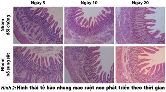 Heo con có nhu cầu sắt rất cao (7-16mg/ngày) bởi hai lý do: heo con không dự trữ nhiều sắt và chỉ dùng đủ trong 4 ngày đầu sau sinh, heo con nhận được lượng sắt cung cấp qua sữa heo nái chỉ khoảng 1mg/ngày (Svoboda, 2017); tốc độ tăng trưởng đặc biệt của heo con, tăng gấp đôi trọng lượng sau khi đẻ 7 ngày và tăng gấp 4 lần sau 21 ngày (Szudzik, 2018). Bổ sung chất sắt cho heo con nhằm tối ưu hàm lượng hemoglobin và phát triển hồng cầu, phát triển nhung mao ruột và đảm bảo sự phát triển bình thường của các tế bào miễn dịch (Cronin, 2019), giúp heo con phát huy tối đa tiềm năng tăng trưởng và sức khỏe ban đầu. Nghiên cứu của Pu và CTV (2018) cho thấy, cung cấp chất sắt giúp tăng chiều dài nhung mao ruột và độ sâu khe tuyến ruột (Hình 2), giảm tình trạng bệnh lý của tá tràng và có lợi cho sự phát triển màng nhầy ruột. Ngoài ra, chất sắt cũng ảnh hưởng đến sự phát triển miễn dịch niêm mạc ruột thông qua việc kích thích sản sinh các cytokine và tăng khả năng thực bào của các tế bào bạch cầu đơn nhân.