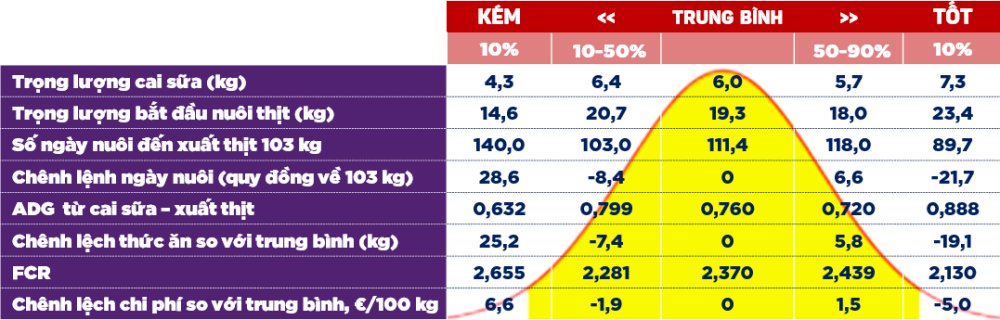 Tác động hiệu quả trong giai đoạn heo con theo mẹ không chỉ ảnh hưởng đến giai đoạn sau cai sữa mà còn đến lúc xuất thịt. Các chỉ tiêu quan trọng trong giai đoạn theo mẹ bao gồm: tỉ lệ tiêu chảy, tỉ lệ chết, tỉ lệ điều trị bằng kháng sinh, trọng lượng cai sữa. Phân bố trọng lượng sau cai sữa với nhóm trọng lượng thấp và trọng lượng cao có ảnh hưởng rõ rệt đến năng suất nuôi thịt, kể cả tăng trọng bình quân, hệ số chuyển hóa thức ăn (FCR) và số ngày nuôi đến xuất chuồng.