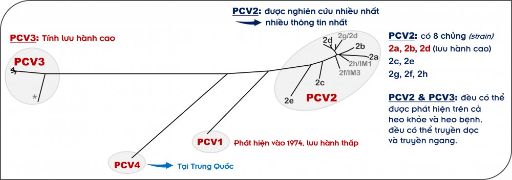 PCV2 và PCV3 đều phân bố rộng khắp, có thể truyền dọc hoặc truyền ngang, đa dạng đường truyền lây và cách bài thải virus, ngoài ra cả hai có thể phát hiện trên các loài khác không chỉ trên heo. Tuy nhiên, sự giống nhau ở cấp độ axit amin của khung đọc mở ORF2 giữa PCV2 với PCV3 chỉ có 31% (với PCV4 là 45% và PCV1 là 70%). Vì vậy, không nên kỳ vọng vào bảo hộ chéo chống các dòng PCV.