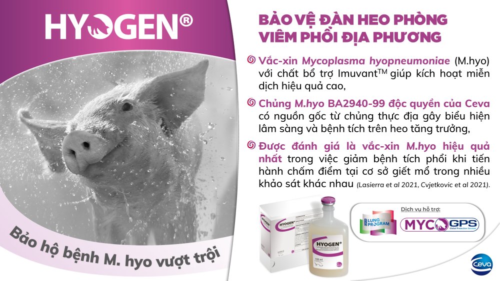 Sử dụng HYOGEN® nhằm kích hoạt hệ thống miễn dịch chủ động của heo kiểm soát bệnh viêm phổi địa phương do Mycoplasma hyopneumonia.