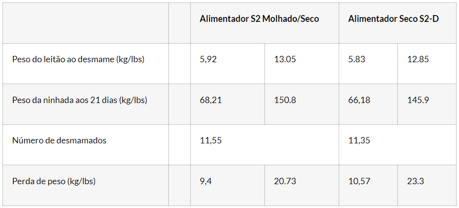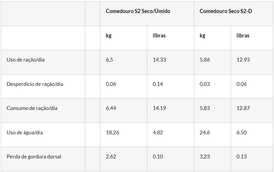No geral, os dados demonstram que as fêmeas alimentadas em comedouros secos/úmidos consomem mais ração, perdem significativamente menos gordura dorsal e perdem menos peso, mantendo assim uma condição corporal melhor, permitindo pesos de ninhada maiores do que as fêmeas alimentadas em comedouros secos.