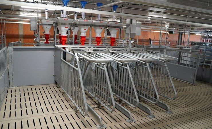 Proteção da fêmea que se alimenta, das demais, por sistema de fechamento de baia com gangorra.