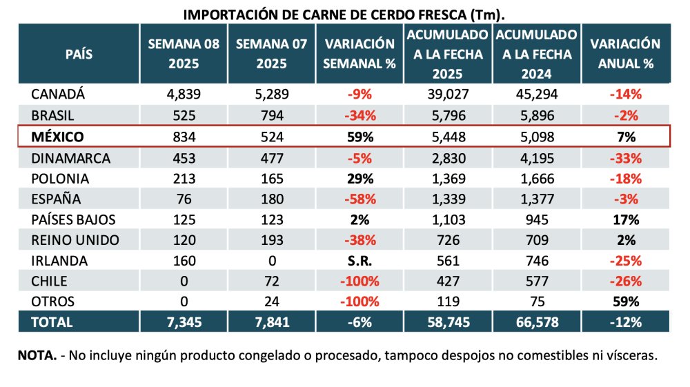 Importaciones de carne de cerdo fresca de Estados Unidos, semana 8 del 2025