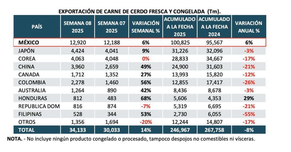 En la semana 8 de 2025, las exportaciones de carne de cerdo fresca de Estados Unidos tuvieron un repunte del 14 % frente a la semana previa, alcanzando 34 100 toneladas. A pesar de este crecimiento semanal, el acumulado del año registra una caída del 8 % respecto a 2024, con un total de 246 900 t. México continuó aumentando su demanda, con un alza semanal del 6 % y un acumulado anual de 100 800 t. un 5.5 % más que el año pasado. Por su parte, Japón adquirió 4400 t en la última semana, un incremento del 9 %, aunque su acumulado anual de 31 200 t sigue siendo un 3 % menor en comparación con 2024.