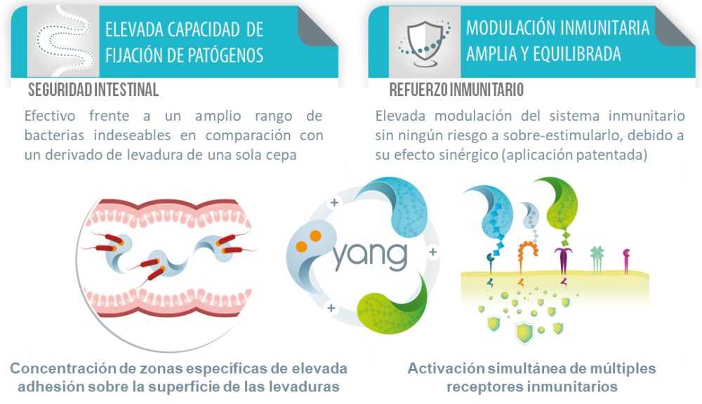 YANG ayuda a mantener unas buenas funciones digestivas y asegura los rendimientos productivos durante los periodos de estrés, mediante la modulación inmunitaria local y limitando el desarrollo de bacterias indeseables en el intestino. La inclusión de YANG se debe ajustar en función de la especie de destino y de las condiciones de desafío de la granja: destete, fase estárter, transición,…