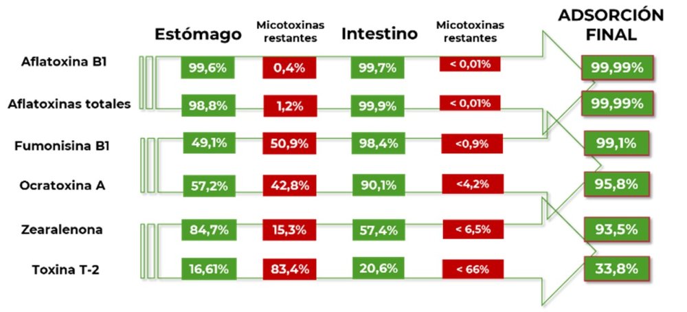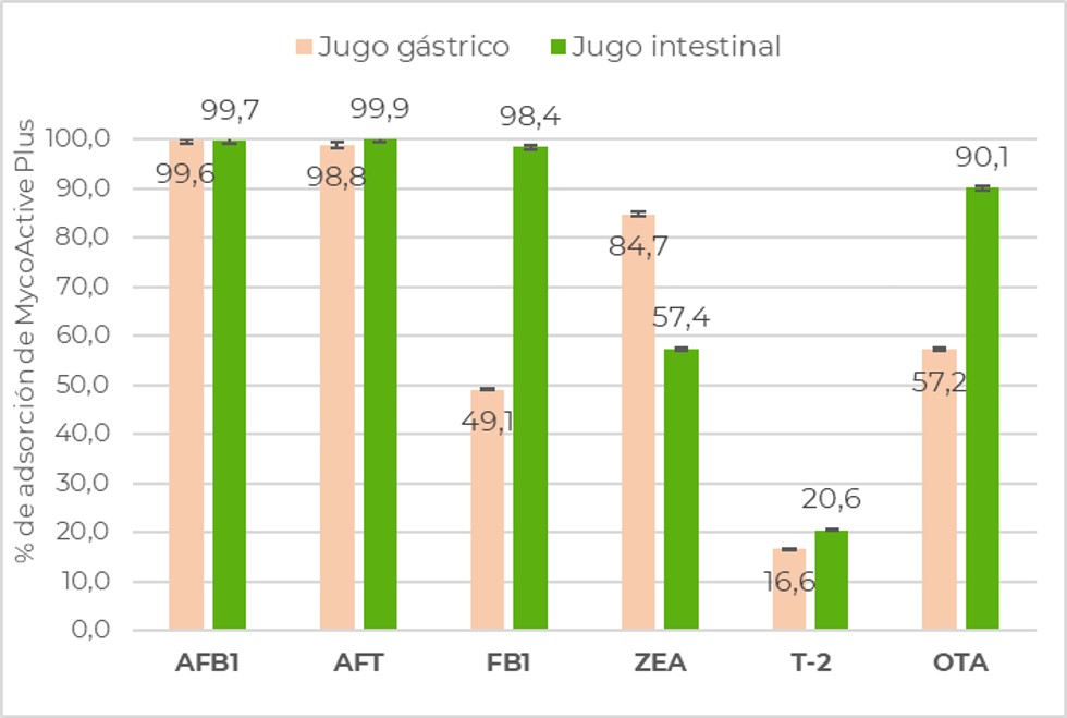 Los resultados indican que, tanto en el medio gástrico, así como en el jugo intestinal, MycoActive Plus es una estrategia eficaz para la adsorción de un amplio espectro de micotoxinas.