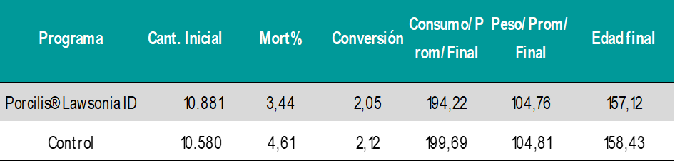 El grupo vacunado con Porcilis ® Lawsonia ID obtuvo mejores resultados en optimización de alimento, mortalidad comparada con el control. (resumen en tabla 1).