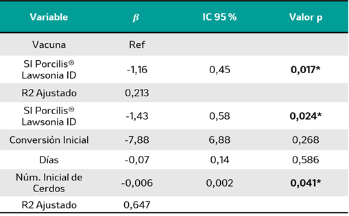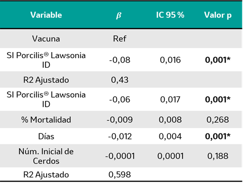 Para la evaluación económica se consideraron las variables y mortalidad (%), alimento consumido Kg (USD 0.622), Peso vivo Kg (USD 2.54) además la inversión para la vacunación con Porcilis® Lawsonia ID.