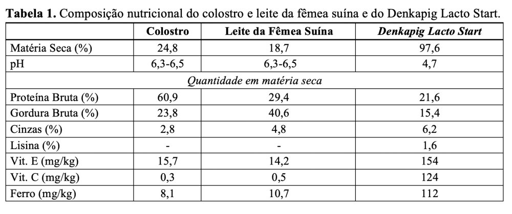 Um sucedâneo lácteo que vêm demonstrando ótimos resultados à campo é o Denkapig Lacto Start, produto formulado pela multinacional Denkavit, que firmou recentemente parceria com a Núttria. O Denkapig Lacto Start se apresenta como sucedâneo lácteo formulado com ingredientes de altíssima qualidade e biodisponibilidade, os quais fornecem composição nutricional adequada à suplementação do leite da fêmea suína nesta fase, conforme tabela comparativa abaixo: