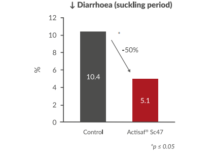 Se ha demostrado que la suplementación con Actisaf® Sc47 produce una reducción notable del 50 % en la incidencia de diarrea en lechones durante el período de lactación (Figura 1). Esta notable mejora respecto a la incidencia de diarreas añade información valiosa sobre la eficacia de Actisaf® Sc47 para mejorar la salud general y la resiliencia de los lechones.