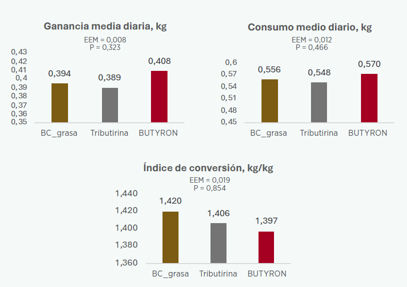 El grupo BUTYRON mostró un mayor peso final, mayor ganancia diaria y mejores índices de conversión en las diferentes fases del estudio.