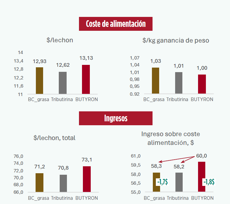 La inclusión de BUTYRON en la dieta de los lechones durante las fases de prestarter y starter demostró un rendimiento productivo superior y mejores retornos económicos en comparación con las otras formas de ácido butírico probadas.