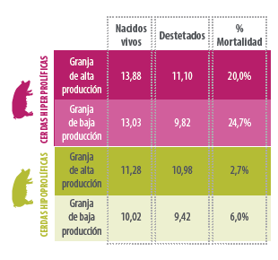Así, si analizamos con detenimiento estos resultados (Tabla 1), dejando a un lado el efecto del número de partos y analizando los datos como media de la relación entre tipo de cerda (Hiperprolífica vs Hipoprolífica) y nivel de producción de la explotación (Alta vs Baja), se observa, como es de esperar, que la prolificidad de las cerdas incrementó de media en un 26% los nacidos vivos (2,8 lechones). Sin embargo, de media, estas mismas cerdas tan solo consiguieron destetar un 3% más de lechones por cerda (0,26 animales). Por lo tanto, las cerdas presentaron un drástico incremento de la mortalidad, que pasó de un 4,6% de media en las cerdas hipoprolíficas a casi un 29% en las hiperprolíficas.