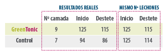 Tal y como se puede observar en la Tabla 2, el grupo GreenTonic, al presentar un mayor número de camadas, tuvo 31 lechones más al nacimiento y 29 al destete. Sin embargo, al estimar la evolución, teniendo en cuenta un mismo tamaño de partida en ambos grupos, se observa que la inclusión de GreenTonic en paridera permitió destetar un lechón más por grupo.