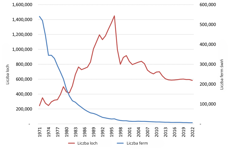 Ryc. 1: Liczba ferm trzody chlewnej i populacja loch na Tajwanie od 1971 r.